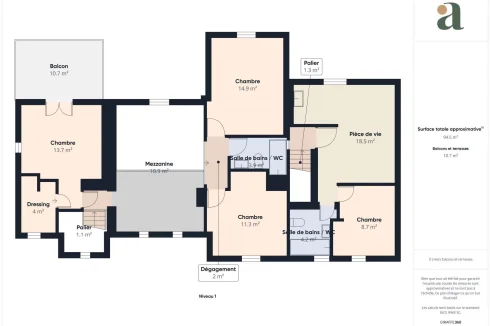 Upstairs, you'll find three additional bedrooms, including one with dressing room and private terrace, a bathroom with Wc and a mezzanine overlooking the living room.