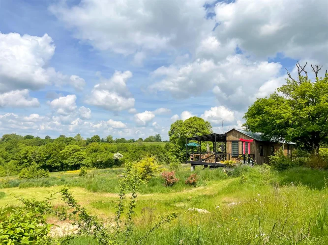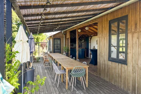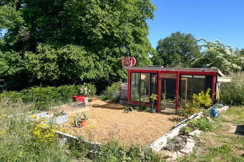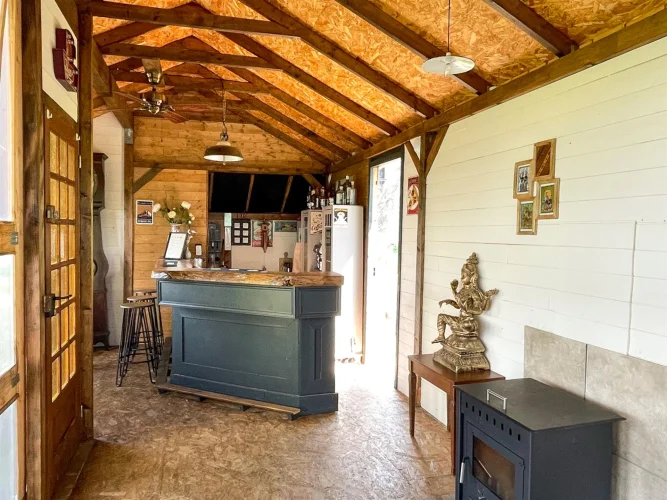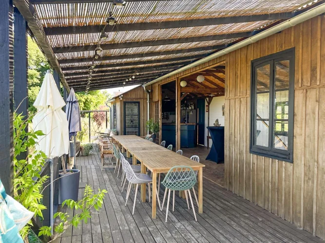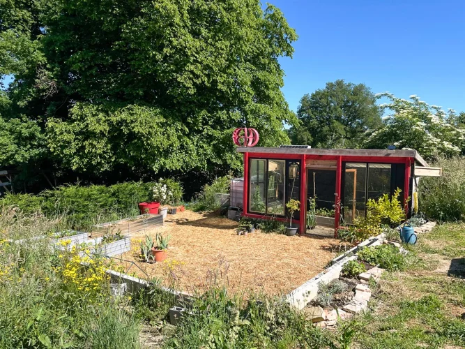 In the garden there is an outbuilding with a terrace for the table d'hôtes of the campsite guests and to serve as a bar. There is also an outdoor kitchen. The grounds are maintained according to the principle of permaculture and are full of young fruit trees and beautiful perennials. The plants are grown in a glass greenhouse.
