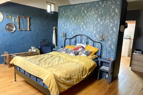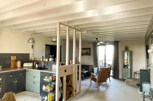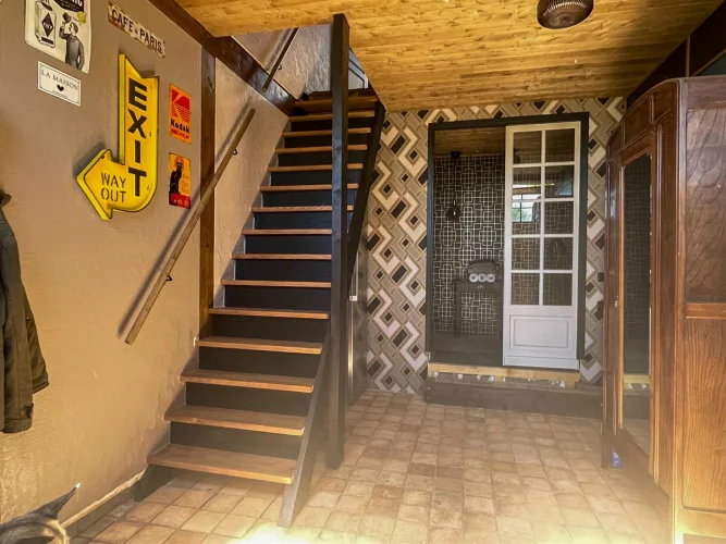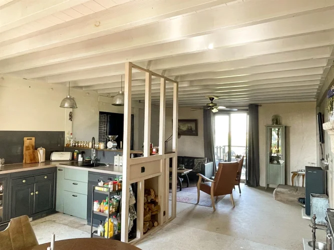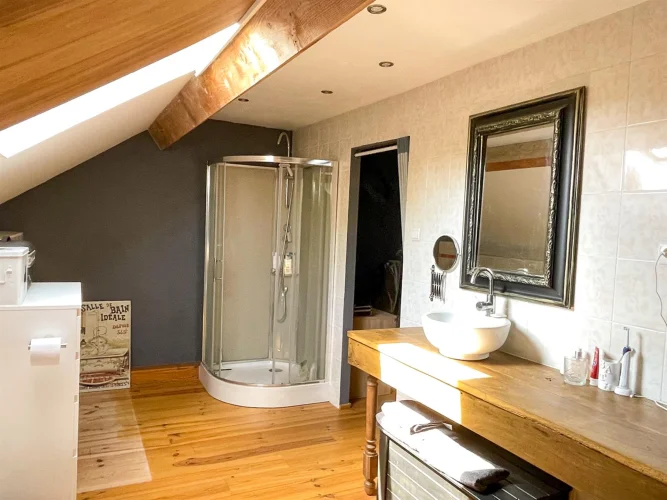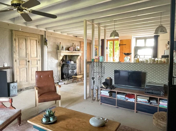 Pretty house on a beautiful plot of land with permit for mini-camping in Allier, Combrailles, Auvergne. Inside, the house has been redone. On the ground floor is a large entrance with the living room and kitchen open to the right. From here there is access to a terrace with beautiful views of the valley. Behind the entrance is a double bedroom. It can be used as a guest room as it has an en-suite bathroom. The hallway also gives access to the workshop located in the old barn.