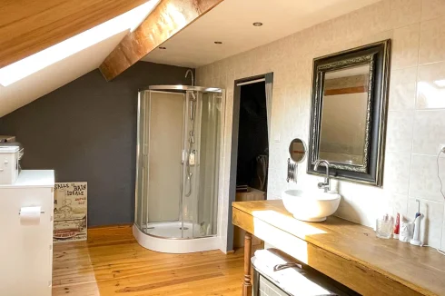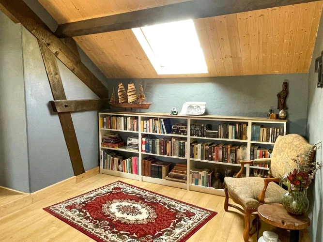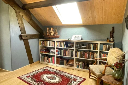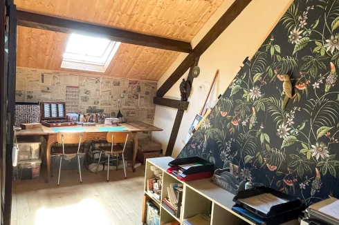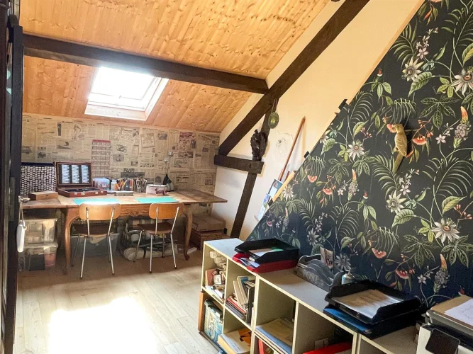 Upstairs are 3 bedrooms. Bright rooms thanks to the Velux windows in the roof. There is also a storage room. The master bedroom has its own en-suite bathroom. Under the house is a cellar with an insulated ceiling.