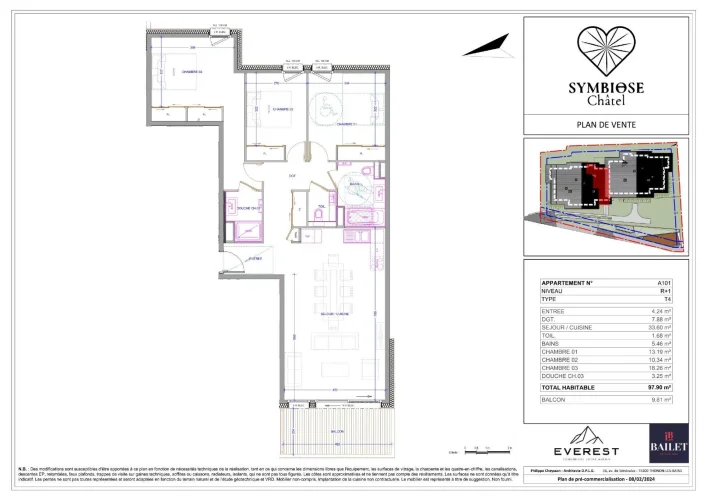 Apartment with 3 bedrooms. Other lots and floor plans are available on request. Discover Symbiose, your new residence in the heart of the village of Châtel ! Treat yourself to a new home in the heart of the village of Châtel, in a rare location that combines peace and quiet with panoramic views. The location is ideal : shops and restaurants are plenty and just a few minutes away on foot, the aquatic centre is a stone's throw away and the ski bus picks you up at the foot of the chalets. The flats combines spacious and bright living areas with large sunny terraces offering superb views of the Portes du Soleil summits. Each apartment has been carefully designed to create a warm and cosy atmosphere, perfect for relaxing with family or friends after a day on the slopes. From 1 bedroom to 6 bedroom + cabin, your elegant and authentic apartment is waiting for you. The price includes one or more garages, a cellar and ski storage. The residence is actually under construction which offers you major benefits as notary fees reduced from 8% to 2.5%. It also allow you to personnalized your apartment. Groupe Bailet, developer since 1979, is well-known and reputed for its clients service and relation. The dedicated team accompany you during your purchase journey, to design your unique apartment according to your needs and vision. You would like to combine your holliday home with a profitable investment ? We assist you on getting your 20% Vat rabat on your purchase price and on renting out your apartment during your absence.