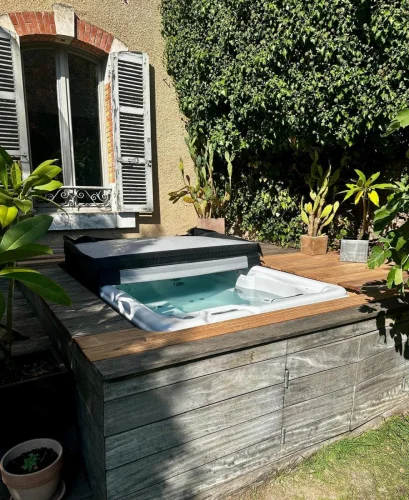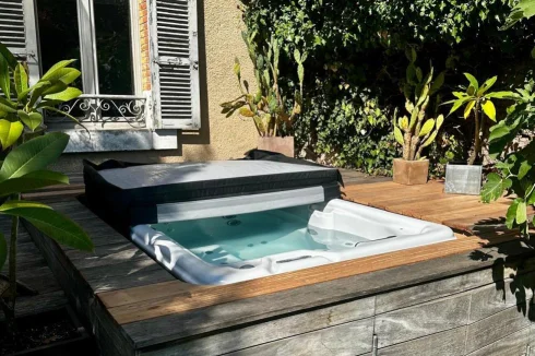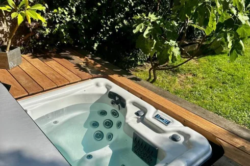 The private garden is divided into a terrace area, grassy area and jacuzzi.