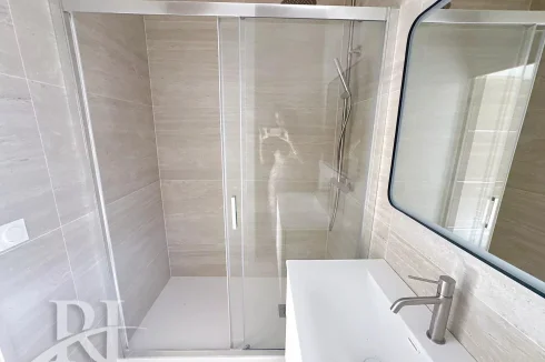 It comprises a fitted kitchen opening onto the living room, a bedroom with its own shower room and toilet, a second bedroom with its own shower room and balcony, and a third bedroom, as well as a courtyard where you can also park a car.