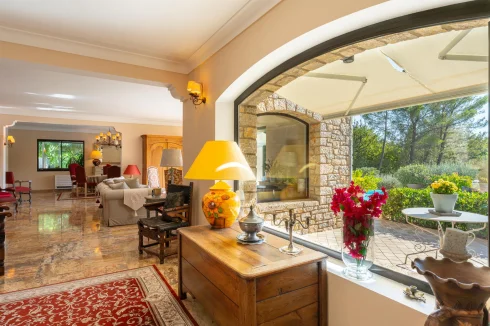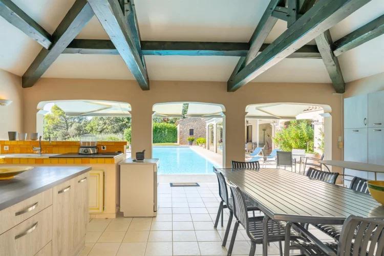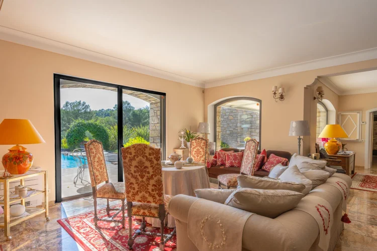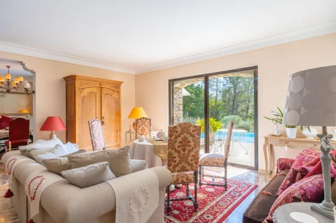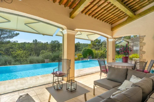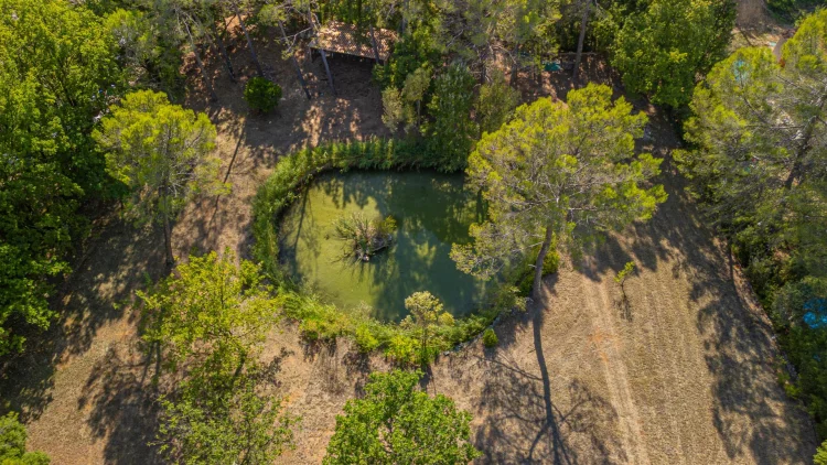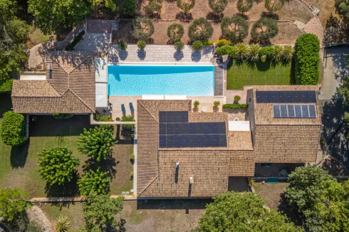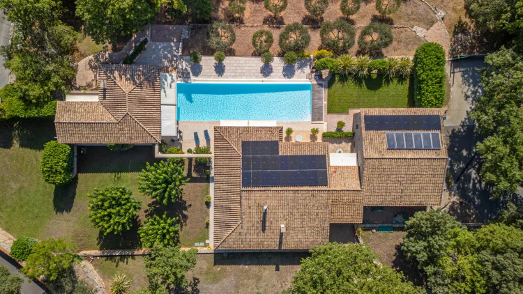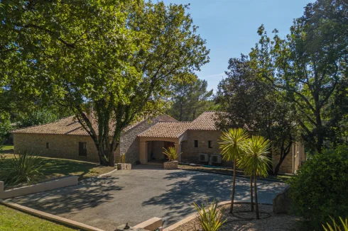 Extender Immobilier presents to you in a natural setting, a remarkable dominant and intimate property of almost one hectare (9960m2), its landscaped park, its olive grove, its private pond, its infinity pool, then its authentic single-storey stone Mas of approximately 300m2 and its outbuildings a few minutes walk from the heart of the Flayoscais village. It is unthinkable not to fall under the spell of this elegant building of character where each space has been designed to offer you a place of tranquility where nature, comfort and serenity combine. A prestigious entrance opens onto an exceptional panorama, like a painting welcomes you. The living rooms, lounges, dining room, office are through, they form a single and generous space of approximately 100m2 bathed in light. They extend onto a large veranda offering an exceptional view of the swimming pool, the gardens and the woods, a true link between the interior and the exterior spaces of the farmhouse. The 20m2 dining kitchen is perfectly arranged and equipped, a utility room will complete it. The sleeping area is located on the opposite wing of the house. The master bedroom of 29m2 has a marble bathroom with shower and toilet, then two other bedrooms with closets of 20 and 13m2 sharing a bathroom. The pool house houses a superb, equipped and protected 60m2 summer kitchen, a real reception area, then an intimate suite dedicated to guests, a bedroom with its storage, its bathroom and its toilet. Surrounded by a terrace, the 18x5 infinity pool will link the living space, its gardens, its wooded park and its private pond, creating an idyllic setting. Let's continue the tour to discreetly discover a sumptuous office of approximately 60m2 in noble wood which offers a lounge area, a library and a sauna. A double garage of 50m2 will complete this property. While retaining its authenticity, the farmhouse offers neat and modern services, aluminum sliding bay windows, sliding shutters, air conditioning by new consoles, marble floor, magnificent interior wooden doors, arched windows, heated swimming pool covered by a submerged shutter, 15 Kw solar panels with 12 Kw batteries, solar water heater, drilling for the garden... A residence of excellence due to its location, its quality of construction and the nobility of the materials used, its services and its various outbuildings... For any information, please contact Valérie Boutemy at or