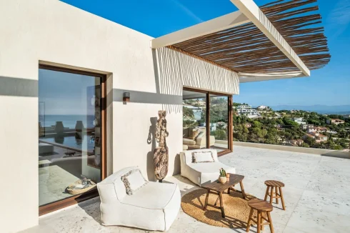 Located on the corniche between Saint Raphael and Sainte Maxime, this contemporary villa of 450 m2 of living space adjoins the 700 hectares of the Petites Maures natural park and offers a panoramic view of the Mediterranean. Clinging to the hillside on a spacious plot of 1588 m2, the villa perfectly blends contemporary lines and warm atmospheres.