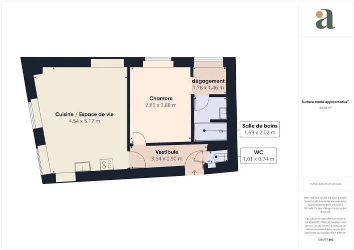 Apartment 2 - 41 m² (1st floor, adjoining): light and airy, sold vacant. It features a living room with kitchenette, a comfortable bedroom, a large bathroom and separate Wc. Refreshments to be provided.