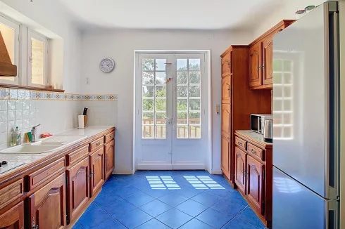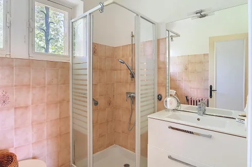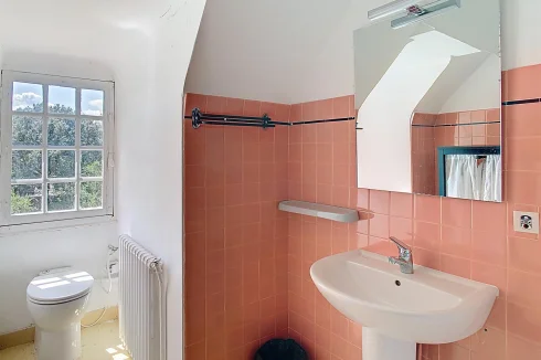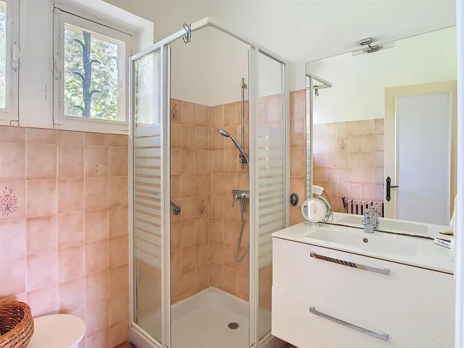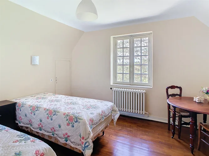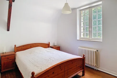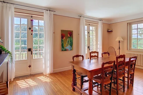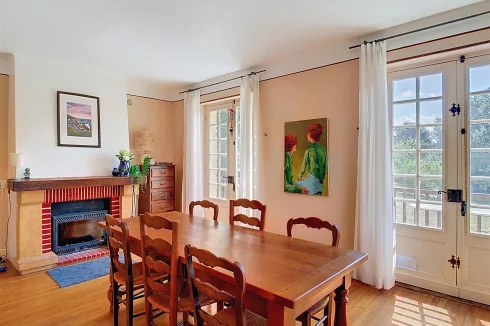 Upon entering, a spacious hall provides direct access to the various rooms. The bright dining room features a cozy fireplace and French doors opening onto a sunny terrace. The adjoining living room offers additional comfort and charm. The kitchen, located near the entrance, also opens onto the terrace—perfect for outdoor dining. This level also includes a bathroom and a separate toilet.