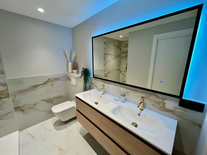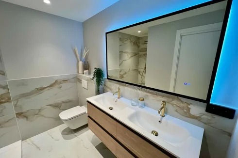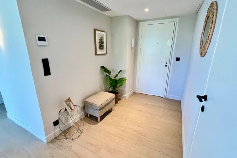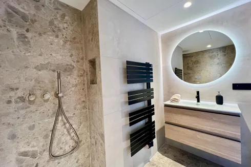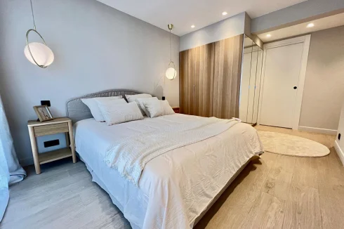 There are two bedrooms, including a master suite, plenty of built-in storage, a walk-in shower room with Wc, a second shower room with Italian-style shower, ducted reversible air conditioning, centralized electric shutters, double glazing, and a prestigious residence with a basement garage.