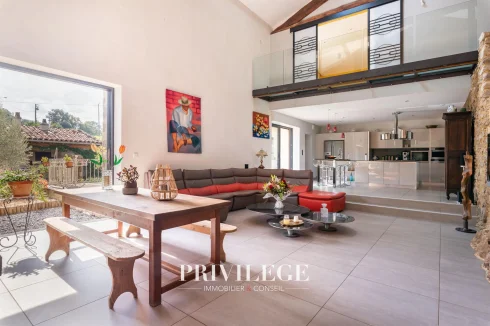 Upon entering, the living room impresses with its exceptional spaciousness. The living room, measuring over 73 m2, is flooded with light thanks to large openings and boasts a spectacular 8-meter ceiling height. A contemporary fireplace emphasizes the unique character of this space, which opens directly onto a pleasant, south-facing Burgundy stone terrace.