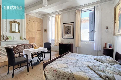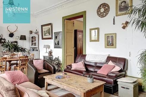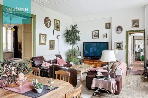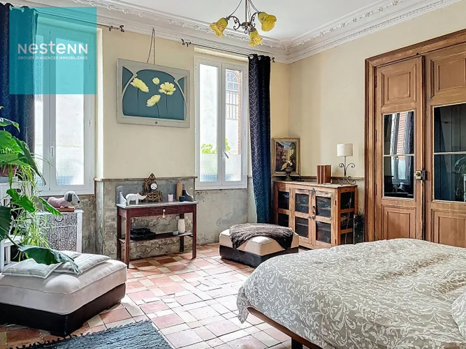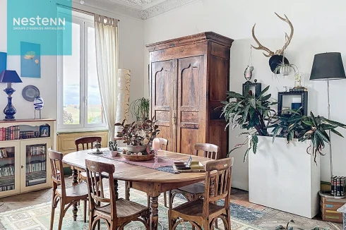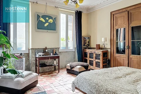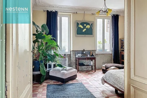 For lovers of homes with character, you will be instantly captivated by its atmosphere, where two architectural styles of the 18th and 19th centuries meet: high ceilings, elaborate moldings, solid parquet flooring with herringbone installation, terracotta tiles, marble fireplace, wooden wall cladding.