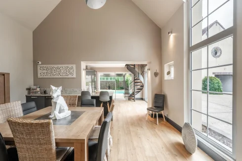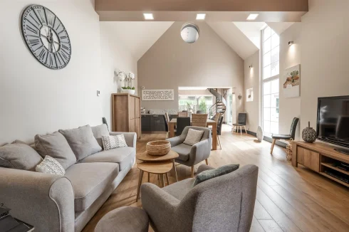 The character front door of this property opens onto an entrance hall with storage space, leading to this magnificent living room with cathedral ceiling, bathed in light thanks to its many windows.