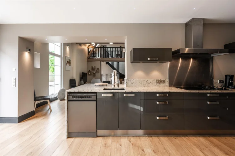 It comprises a living room, a dining area and a large, fully-equipped kitchen combining induction and gas hobs for precise cooking. Also on the garden level is a lovely double bedroom, a bathroom with shower and a separate toilet.