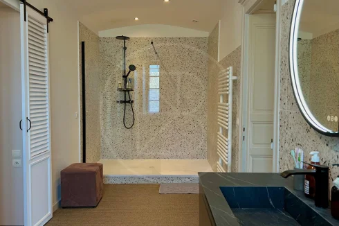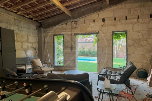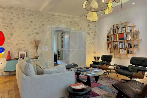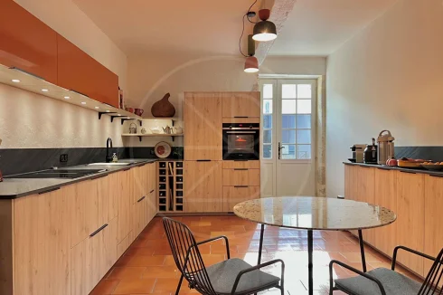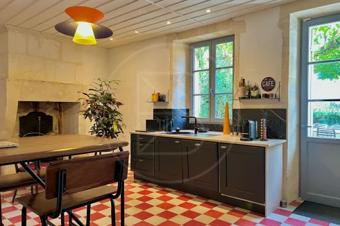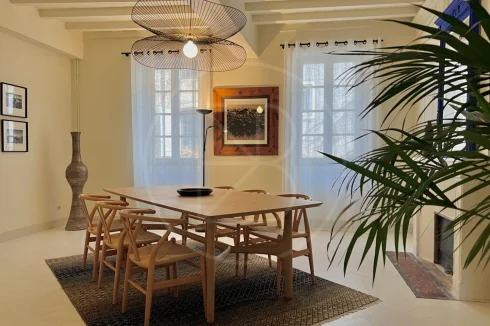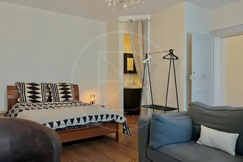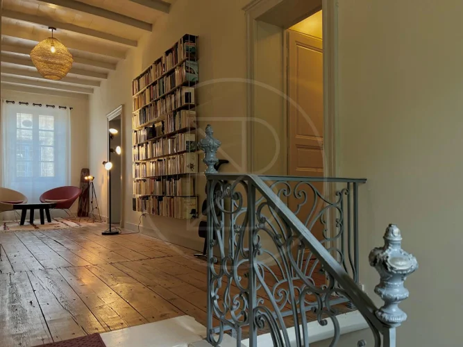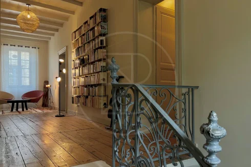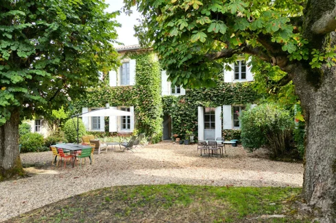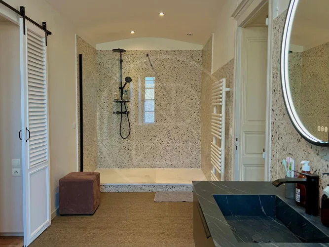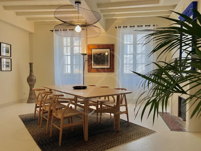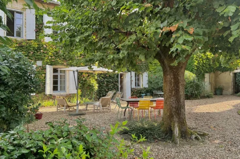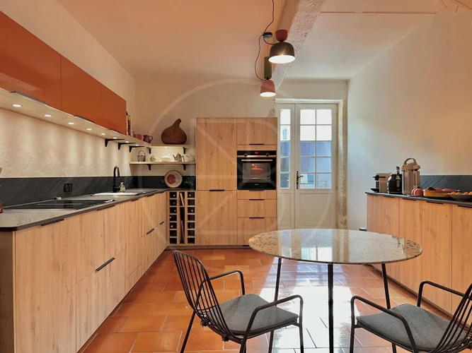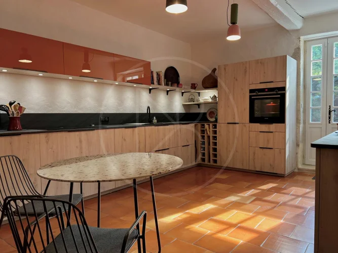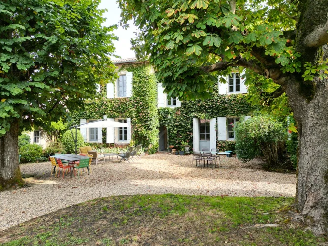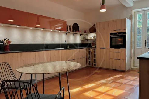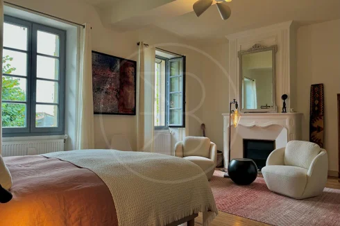 This magnificent house, a former 18th-century estate, combines the most modern comforts with a meticulous preservation of its history. Everything invites you to simply settle in. Stone walls, lime plaster, original terracotta tiles, and wooden floors blend together with refined elegance. The entrance hall, with a white ceramic Godin stove, leads to two living rooms--one formal, the other a cozy garden-facing retreat. The dining room features white parquet flooring and a Klein blue fireplace. A bright, bistro-style room opens to the garden, followed by a spacious modern kitchen with top-end appliances and a service entrance. A pantry/laundry offers generous storage. Upstairs, the main suite includes a garden-view bedroom, stylish bathroom, and custom walk-in closet. Three ensuite bedrooms, one on the ground floor, provide flexible space for guests. Outside: a charming courtyard, heated pool, landscaped garden, converted outbuildings, and a garage with attic. Ideal as a family home or guesthouse/B&B.