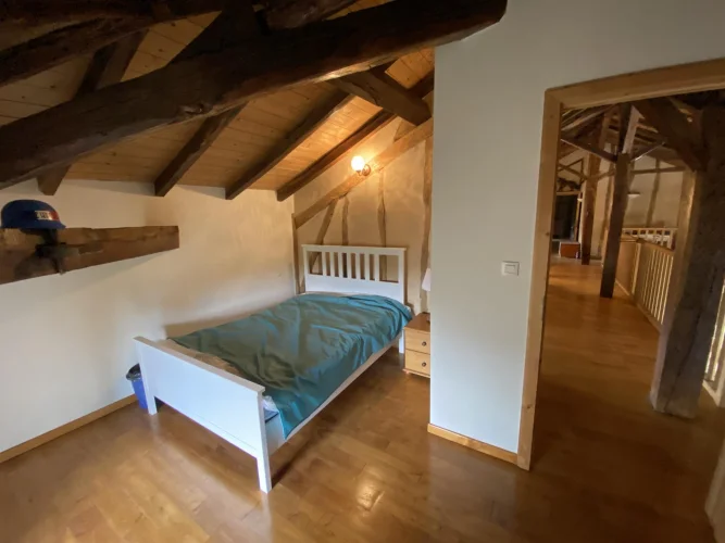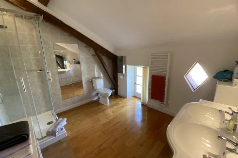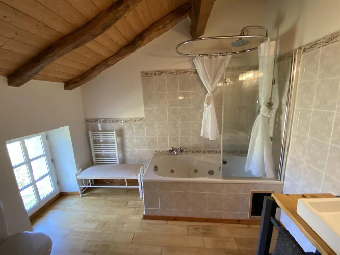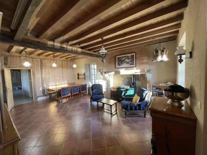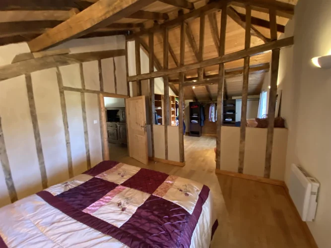 At the end of a tree-lined driveway, beautiful complex comprising a fully renovated 340m2 residential house. Entrance to a 32m2 dining room with fireplace, on the left, Wc. Equipped kitchen of 9m2 and a laundry room/back kitchen of 9m2. Spacious living room with a beautiful partial ceiling height of 102m2 and wood stove, Central wooden staircase 13m2 office area open to the living room Bedroom/office of 13 m2, Upstairs 3 attic bedrooms master suite with a 28m2 dressing room, adjoining bathroom with Wc, storage area. Adjoining bathroom with Wc, the other bedrooms measure between 16 m2 and 9 m2, a bathroom and a storage area. Comfort : Underfloor heating on the ground floor (heat pump), wood stove and double glazing. Dependencies: 180m2 stone barn (former wine storehouse) with new frame and roof. Water access. Awning/Covered parking, pergola. Land: 12,665 m2 with fruit trees, umbrella pine and mature oak. Beautifully landscaped. Terrace with an above ground swimming pool, a large courtyard between the house and the old wine storehouse.