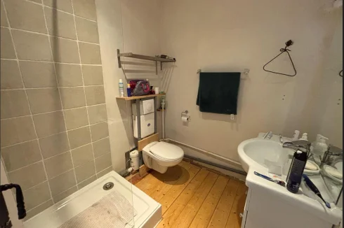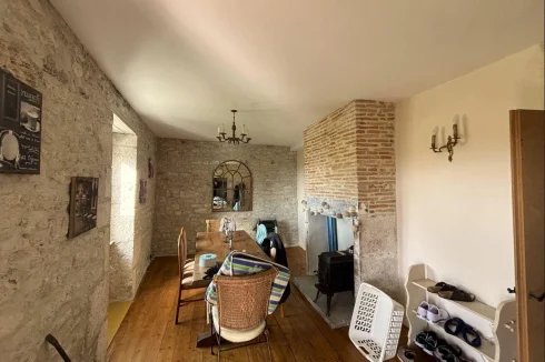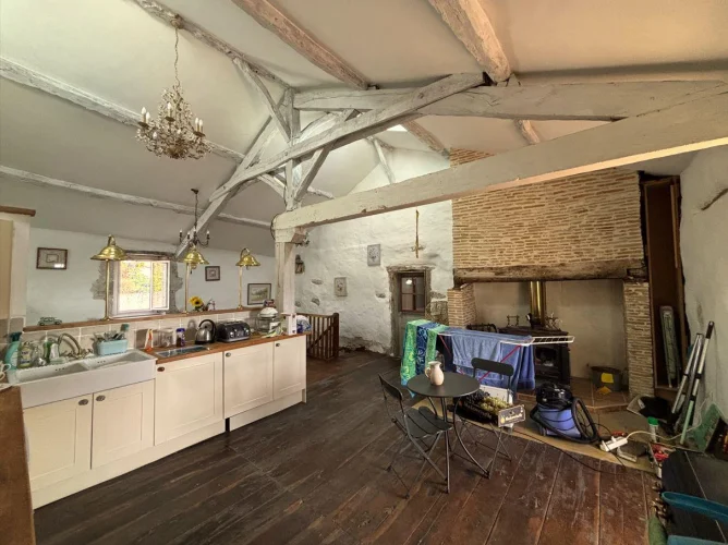 Restored character house, 117 m² of living space comprising a living room with a wood-burning stove, a fitted kitchen with a dining area, two bedrooms, a shower room, and a bathroom upstairs. Four rooms are located on the ground floor.