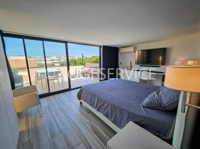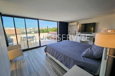 On the 2nd and top floor of a quiet, well-planted residence in St Tropez, a duplex comprising on the 1st level: an entrance hall, a shower room-toilet, a small bedroom, an open kitchen and living room opening onto a private terrace. An external staircase leads to the upper level with a large terrace and its side sea view. A beautiful bedroom with its shower room and separate toilet.