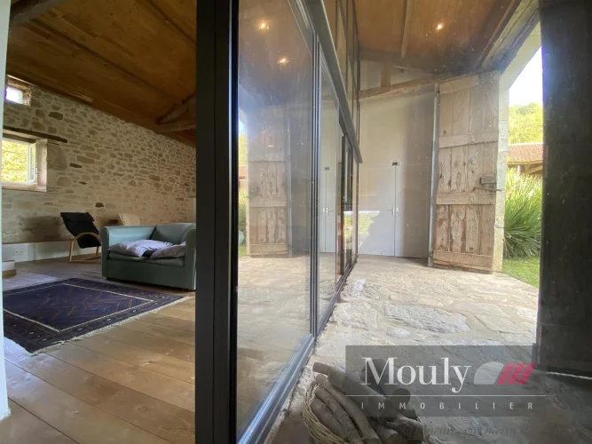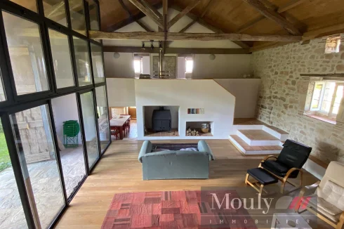High-quality, modern, architect-designed renovation of the barn section, including a beautiful, bright living room with a large aluminium opening, parquet floor and a garden-level stone paved terrace. There is also a mezzanine snug/bedroom as well as 2 bedrooms, a kitchen/dining room, and a shower room, plus a workshop.