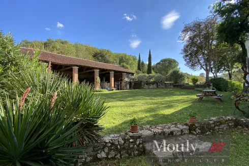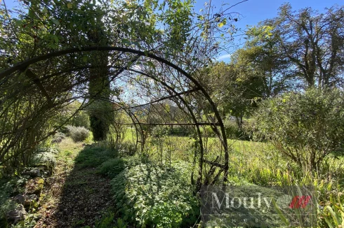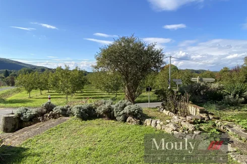 An elegant entrance way from the garden courtyard to a central corridor serves as the axis of circulation from which all rooms radiate offering a sense of symmetry, flow and privacy. This functional design allows natural light to reach each room while maintaining a harmonius circulation throughout the house. Welcome into the great sized kitchen/dining room with 'cantou' fireplace and wood burning stove, old stone sink, oak parquet floor, central island and double aspect large windows looking out over the garden. Magnificent views from the sitting room with poplar floor and french windows opening onto a secret garden and terrace overlooking the valley and the wooded hills. Two spacious bedrooms, both with double aspect windows and a large bathroom with a view complete the living accommodation.