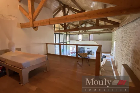 With its exposed beams, high ceilings, oak and poplar parquet floors and generous volumes, it has retained all the charm of the period.