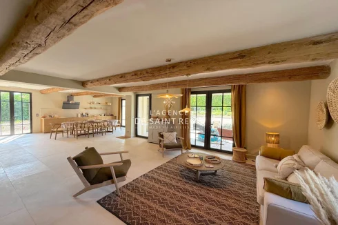 Set on a landscaped plot of 1,800 m² featuring an elegant swimming pool, the property impresses with its generous space and natural light. The large living area is enhanced by a stone floor and a cozy fireplace, creating an atmosphere that is both authentic and refined.