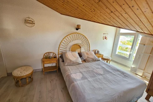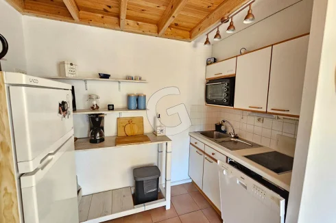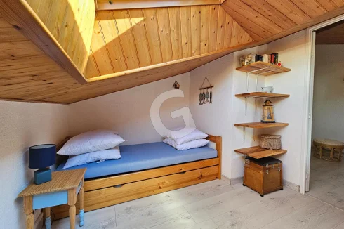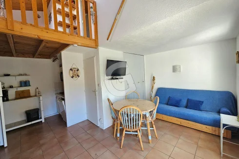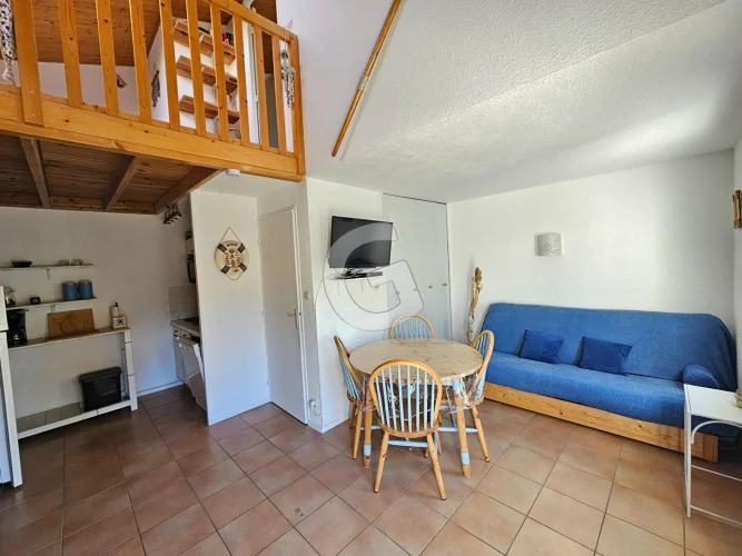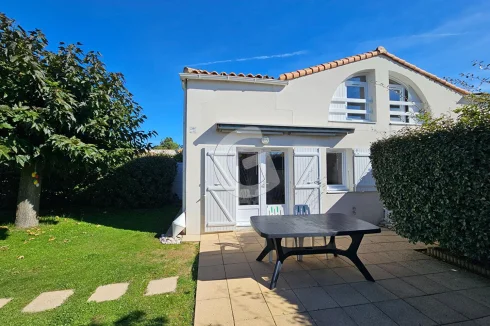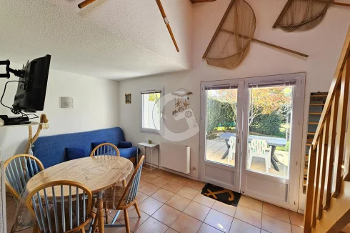 Close to the beach, house in a condominium with swimming pool including living room with open kitchen, shower room and toilet. Upstairs a bedroom and a mezzanine area. All on a beautiful plot of more than 450 m². Secure parking space.