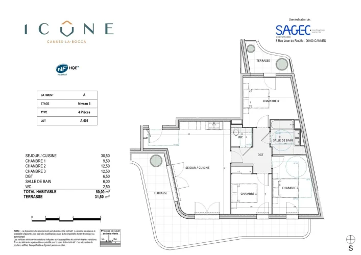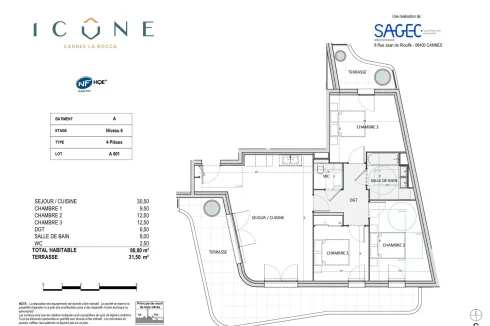 Gorgeous apartment with 3 bedrooms and its amazing terrace ! Other lots and floor plans are available on request. Discover Icône, our new development in Cannes La Bocca ! The privileged location of Icône, just a stone's throw from the famous Croisette, combines village charm, a lively seaside atmosphere and economic dynamism. Living at the heart of this exceptional residence means choosing a convenient lifestyle, with everything within walking distance, from shops to schools. The proximity of crèches, schools, colleges and universities by bicycle in just 5 minutes adds to the convenience. La Bocca also stands out for its immediate proximity to train stations and motorway access, making the area even more attractive for shoppers, with a variety of shopping centres nearby. The flats, ranging from 2 to 5 rooms, have been carefully designed to offer practicality, high-quality features and direct access to magnificent outdoor spaces. Like an archipelago, Icône is made up of 3 buildings that feature a succession of balconies and suspended terraces with undulating, irregular curves, all horizontal, to lighten the traditional vertical similarity of modern buildings. Delicate and ethereal, the floors are adorned with planted flower boxes, inviting nature to punctuate the whole, like a veritable landscape where the vegetation converses with the buildings in complete harmony.
