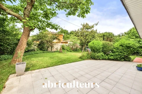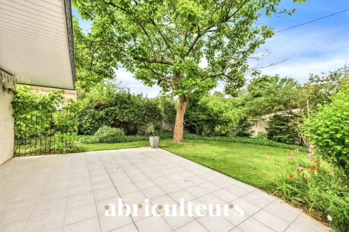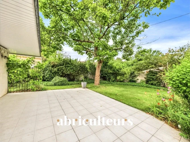 The 980m² plot is fully enclosed by walls, with a motorized gate and videophone at the entrance. The landscaped garden features two practical garden sheds for storage, and a large, well-exposed 50m² terrace extends the outdoor living space.