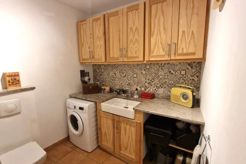 On the top floor. You'll find a charming loft-style room with exposed beams that doubles as another seating area with a sofabed and a summer kitchen. With fitted units. A sink. And space for a fridge / freezer. This summer kitchen is perfectly placed by the pretty roof terrace. It will allow you to entertain your guests and keep close to the party without having to run down to the kitchen for more drinks. Glass doors lead to the sun-drenched terrace with exposed stone walls and an electric blind for shade.