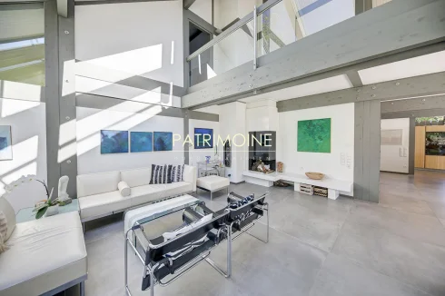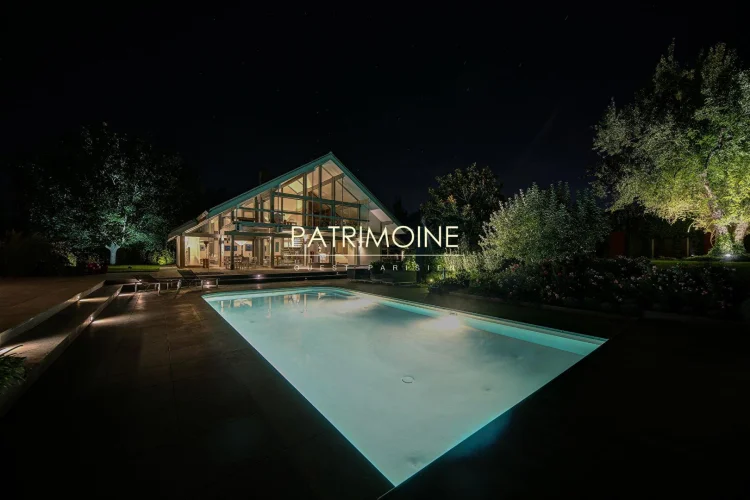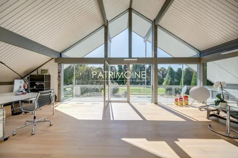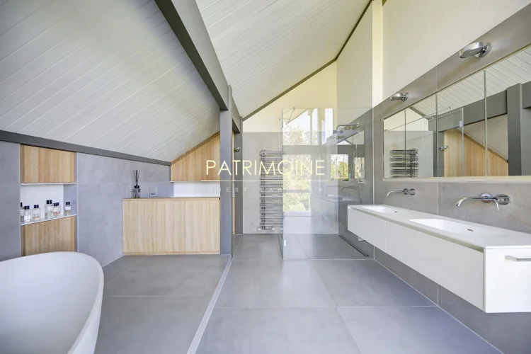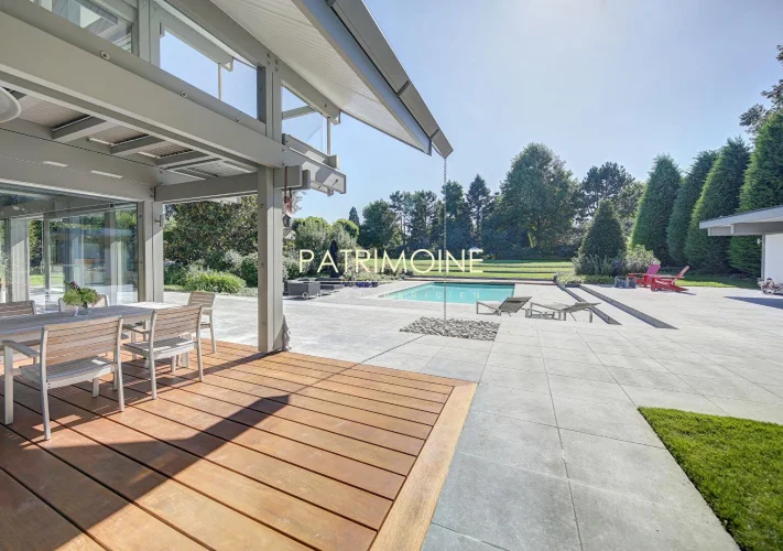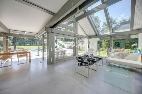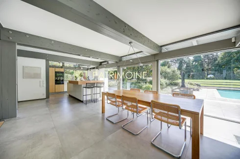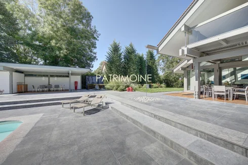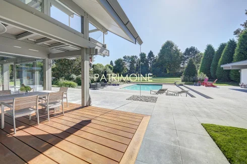 This is a truly unique home, ideal for those seeking privacy, modern architecture, and light-filled spaces thanks to expansive floor-to-ceiling windows. Additional highlights include high-end materials and finishes throughout, triple exposure with panoramic view of the garden and pool, beautifully landscaped grounds, and efficient energy performance (new Viessmann boiler, forced air system, heat pump, air-conditioning, gas hot water, radiators, and underfloor heating in bathrooms). The pool was completely renovated in 2025, fitted with a heat pump and heated pool house.'
