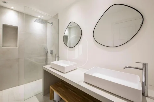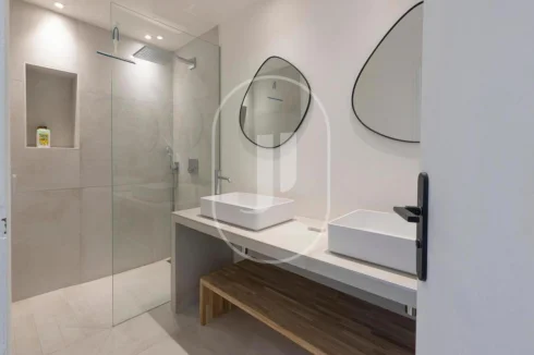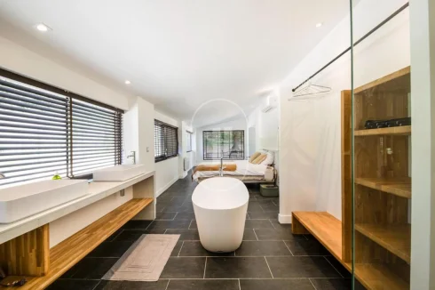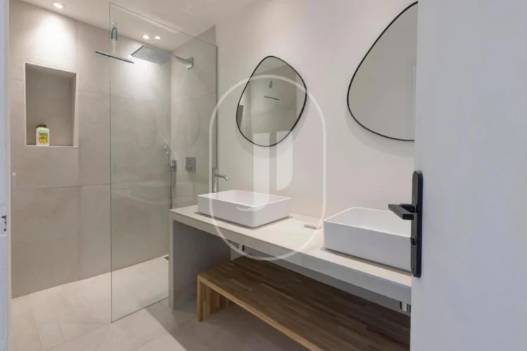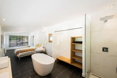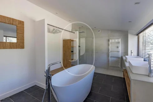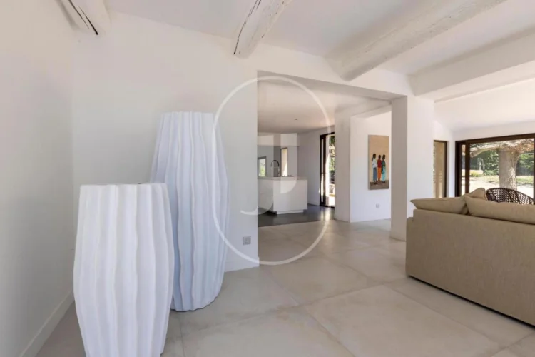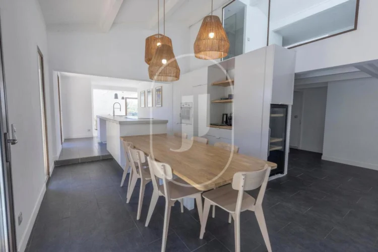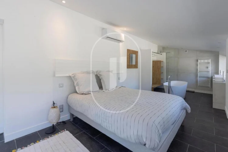 Mostly on one level, the bright house offers a large south-west facing living room opening onto terraces with a view, an equipped American kitchen, laundry room, 2 bedrooms sharing a bathroom, a bedroom with a bathroom, a 4th bedroom en-suite with a bathroom, and in the mezzanine a loft room (office or 5th sleeping area).