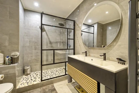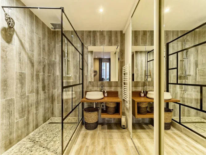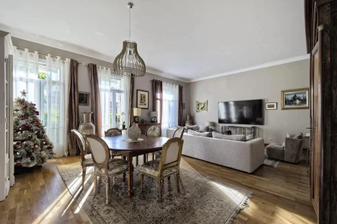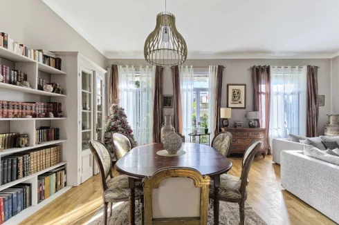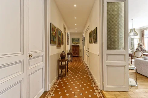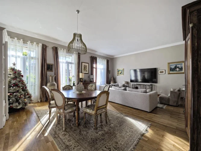 Located in a charming bourgeois-style residence, this elevated ground floor apartment offers 141.38 m² of living space (Loi Carrez). It features a spacious entrance hall, a generous living area with lounge and dining space, a fully equipped separate kitchen, three bedrooms, one shower room with Wc, an additional shower room, and separate guest toilets.