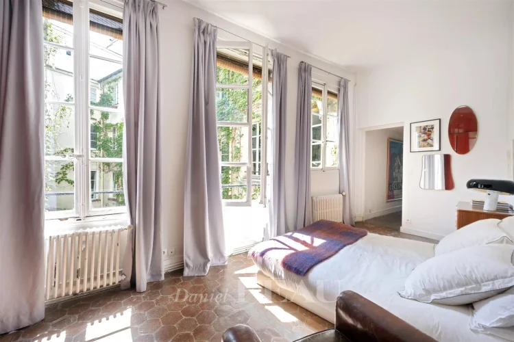 Rue de Saintonge, in the historic Haut Marais neighbourhood. This magnificent dual-aspect apartment is on the second floor of a superb early 18th century building featuring a remarkable façade and a majestic main staircase.
