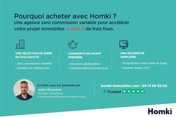 Homki offers buyers and sellers a complete and transparent service so that each real estate project is an innovative experience lived serenely. Our agency fees are €4,900 fixed to be paid by the seller.