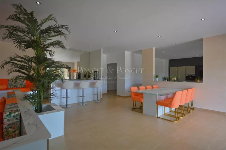 This villa is entirely on one level. The large living room is bathed in light thanks to its large picture windows that open onto the terraces and garden. It offers three independent suites. A fourth bedroom can be created in place of the large study, offering even greater flexibility.