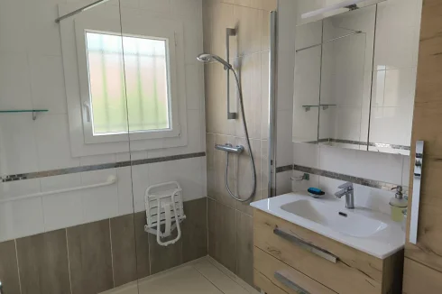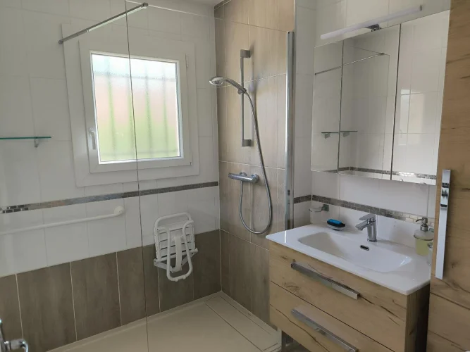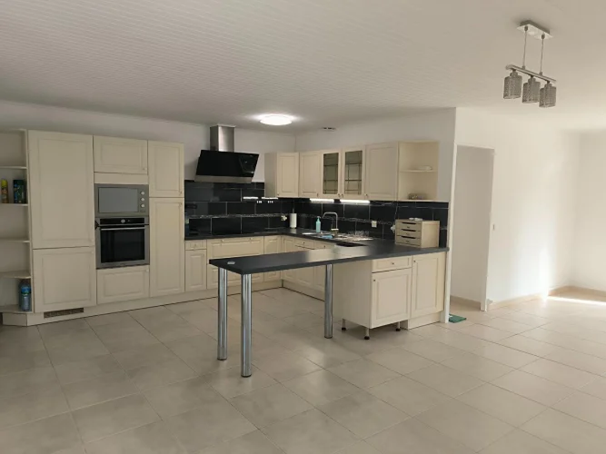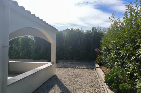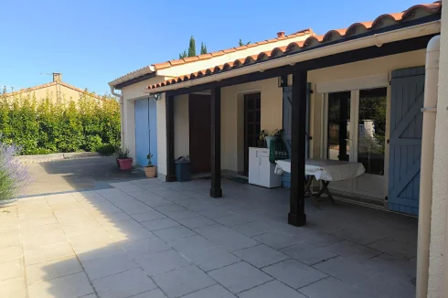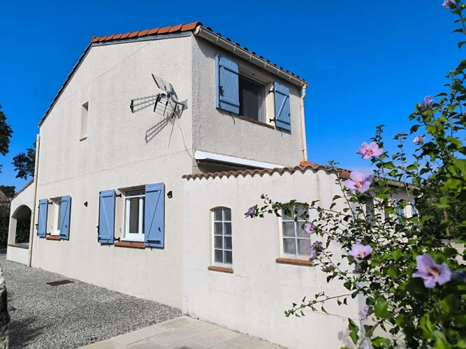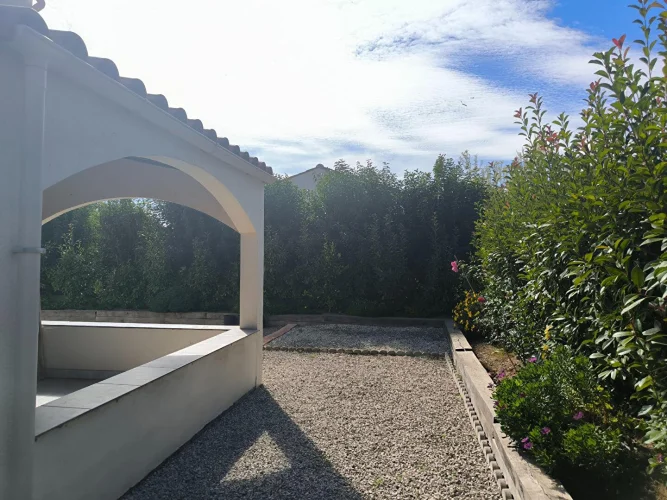Bellissimmo Narbonne Agency presents: Ginestas: 106m2 fully renovated 1980s house on 596m2 of enclosed land, free on 4 sides R 1. Comprising on the ground floor: Entrance hall, fitted kitchen opening onto a large living room, one bedroom, shower room, separate toilet, office. Upstairs: two bedrooms, shower room, toilet, garage with attic, terrace, bowling alley. High-Quality renovation, Pvc double glazing, wooden shutters, reversible air conditioning and electric heating. The land is suitable for a swimming pool. Village near the Canal du Midi with amenities.