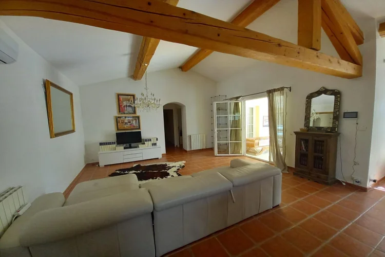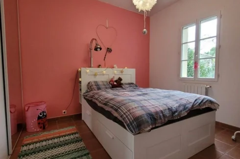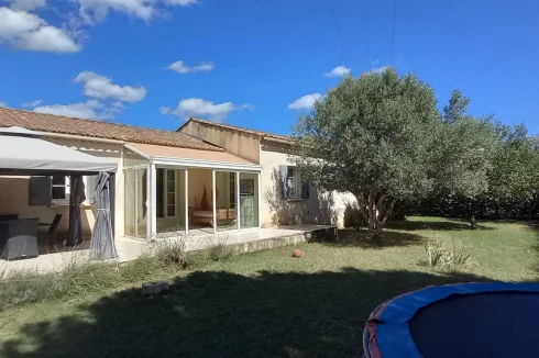 Saint Quentin La Poterie, within walking distance of shops, single-story villa from 2003, approx. 134 m² on a plot of approx. 900 m², not overlooked and without nuisance. Entrance via a 16 m² winter veranda, large living/dining room of 52 m² with a recently fitted kitchen. Three beautiful bedrooms, one of which is 22 m² with a 5 m² dressing room. Bathroom + shower, 2 toilets. Garage. 6X3 swimming pool with shelter. Drilling and automatic watering.