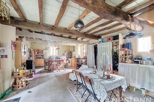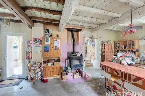 As soon as you enter, a covered terrace welcomes you and opens onto a warm living room of 29 m². A few steps lead to a large bright living room, of 43 m², including a fitted and equipped kitchen as well as a convivial area with wood stove.