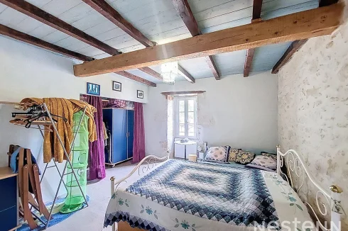 Upstairs, a bright landing of 16 m² converted into a sleeping area leads to a large bedroom of 17 m² and a bathroom with toilet.