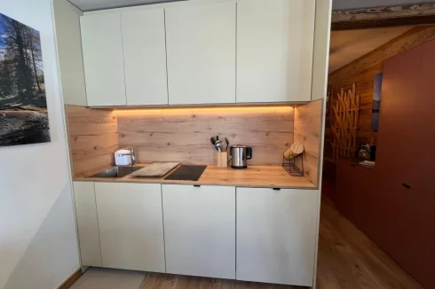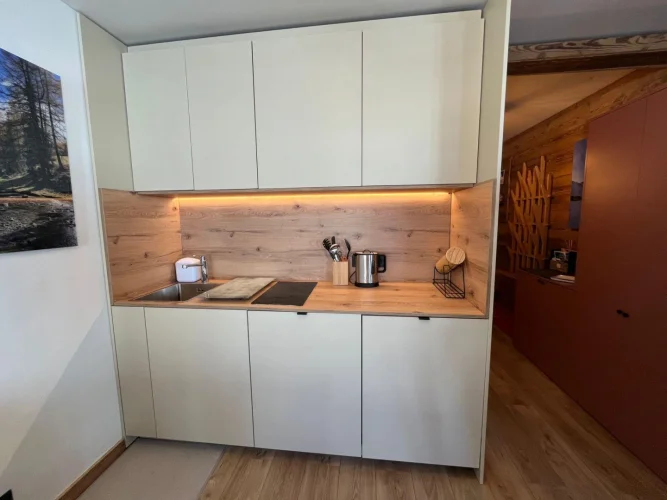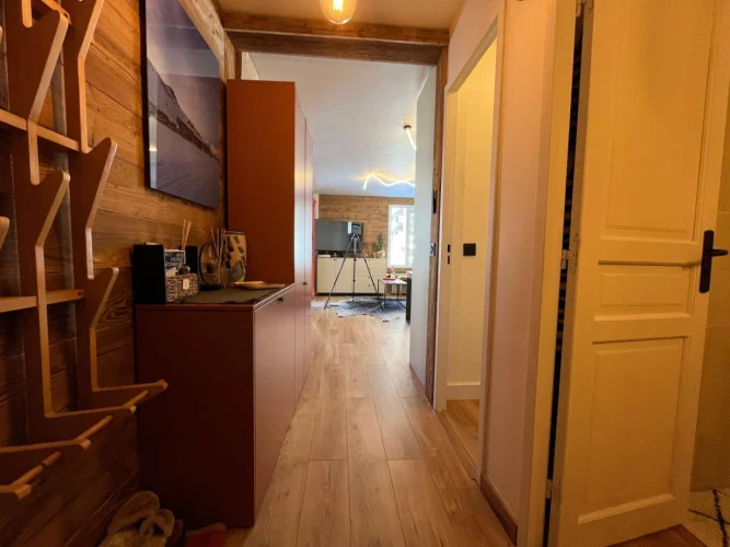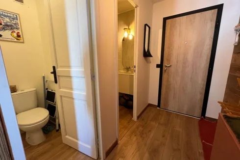 It consists of an entrance with storage, a living room with a kitchen open to the living room giving access to the balcony, a bedroom, a bathroom and a separate toilet. A cellar and a ski locker accompany the apartment.