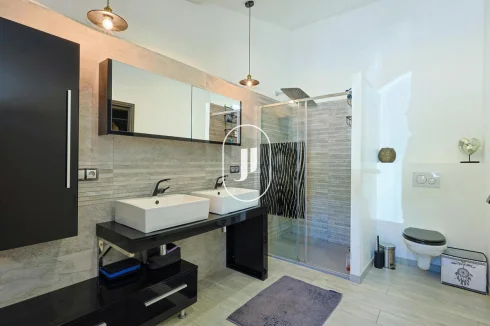Outdoors, the meticulously landscaped garden boasts a large 18x9 m swimming pool, superb shaded terraces totaling around 300 m², a pétanque court, a barbecue area, and an adjoining garage with an electric door. Every corner invites relaxation, in perfect harmony between nature and architecture.