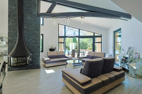 The main house, about 280 m², is centered around a magnificent 90 m² living area, enhanced by a cathedral ceiling, abundant natural light, a sleek designer fireplace, and large openings onto the terraces and garden.