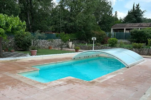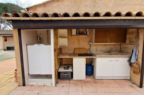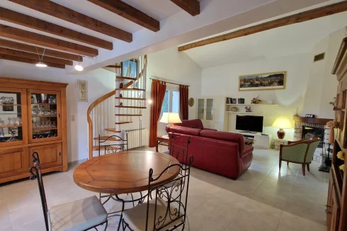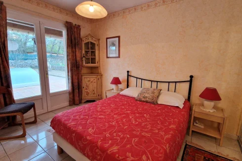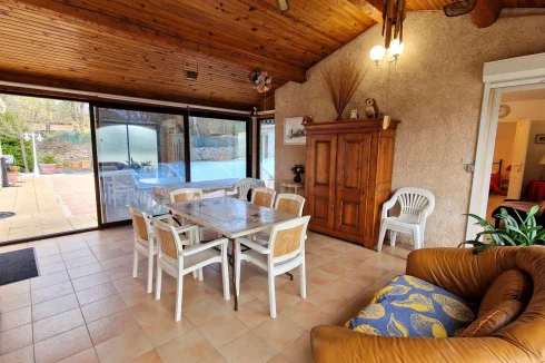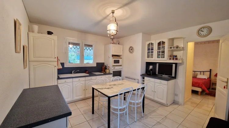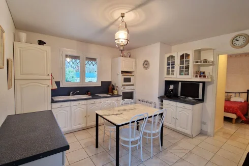 Immoprovence by Victoria Immobilier presents this beautiful villa with a lot of possibilities. Layout of the main house: On the ground floor it has two bedrooms, a fitted kitchen, a bathroom and garage/laundry room. Plus a mezzanine converted as a third bedroom. A veranda connects with the Pool house, which is a T2, so a living room with kitchen, a bedroom and a bathroom + WC.