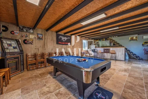 The ground floor features spacious reception areas: a double living room with bar and billiard area, a cozy lounge with fireplace, and a dining room opening onto a fully equipped kitchen with adjoining utility room.