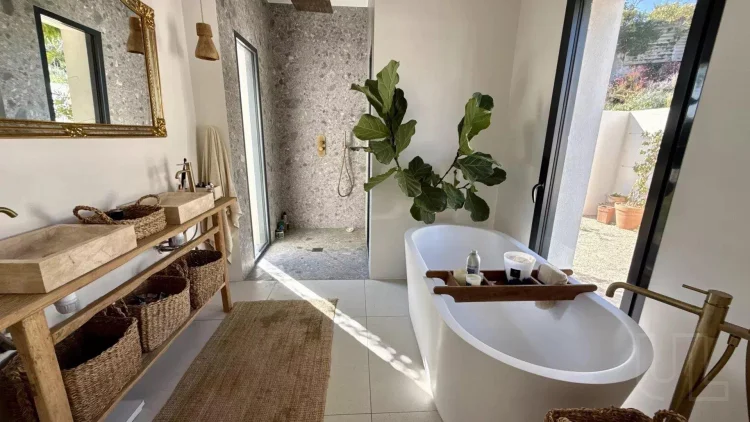 The villa features three bedrooms, including a spacious master suite with a dressing room and a private bathroom with shower, designed to provide the utmost privacy. The two additional bedrooms share a separate bathroom and offer functional, comfortable spaces that can be used for family, guests or as children’s rooms.