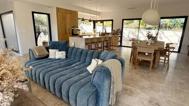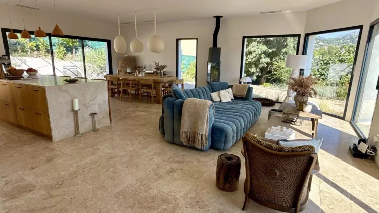 The living area is filled with natural light and comprises a welcoming lounge and dining space centred around a cosy fireplace. The open-plan kitchen, complete with a central island, is perfectly designed for both everyday living and entertaining. It flows seamlessly onto a generous terrace, the ideal place to enjoy warm Mediterranean evenings.