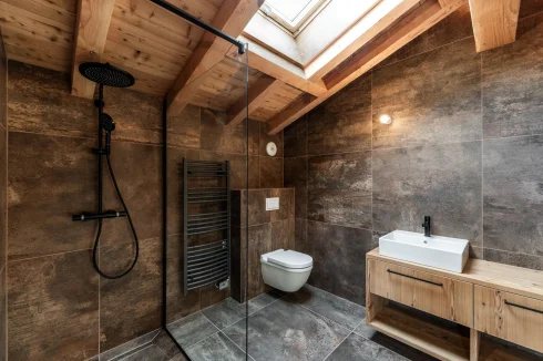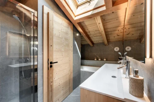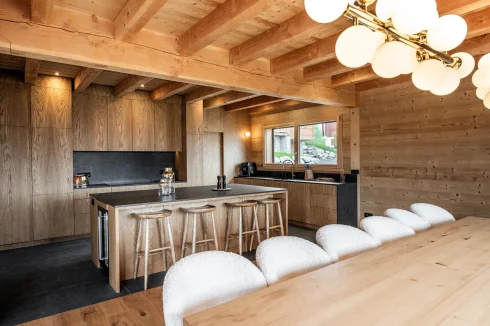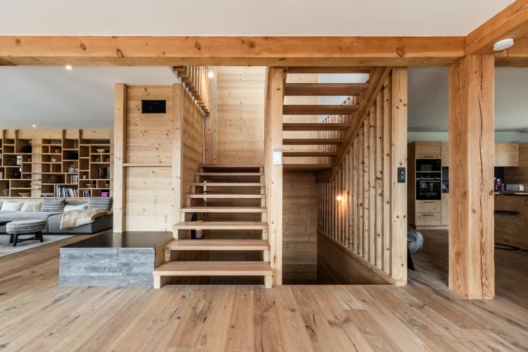 The Chalets are built in the typical mountain style, with a blend of larch and traditional local stone, enhanced by uncompromising interior design: solid wood joinery, cupboards and doors, parquet flooring with underfloor heating, and kitchens with wood, marble or quartz worktops.