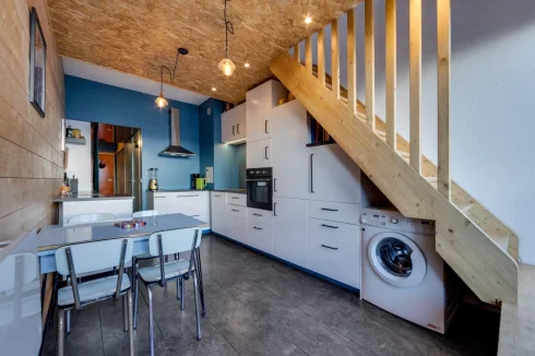 The layout is thoughtfully designed to comfortably accommodate up to 6 people! It features a spacious entrance with a closet, a 'coin montagne' (bunk area), large storage spaces, a living area with a fully fitted and equipped open kitchen, and a bathroom with a large shower. Upstairs, there is a convertible lounge that can be used as a bedroom, as well as a double bedroom with storage.