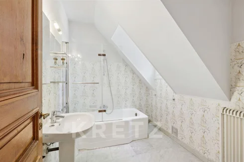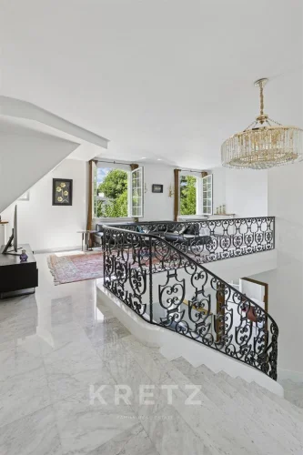 On the garden level: large living room with central fireplace, adjoining dining room, independent kitchen, a master suite, office/library with fireplace. Direct access to a large sun terrace.