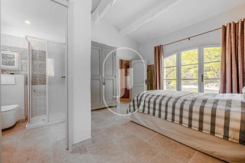 An elegant stone staircase leads to the upper floor where two more bedrooms are located. One features a private shower room, while the other opens onto a terrace with stunning views of the garden. A beautiful separate bathroom completes this floor.