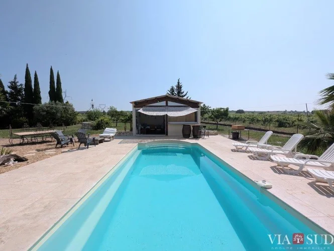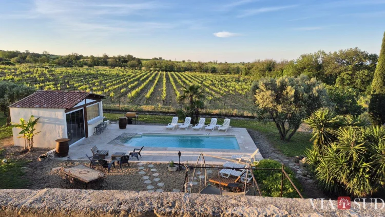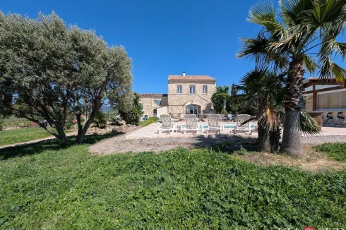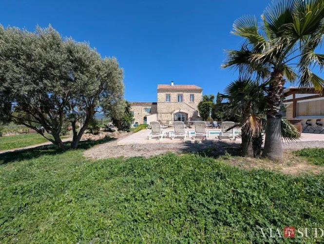 Just 20 minutes from Béziers and 5 minutes from amenities, this magnificent farmhouse, offered exclusively, welcomes you in a peaceful and privileged setting, surrounded by vineyards. The main house offers very spacious accommodations with a large, bright 90 m² living room-kitchen, three beautiful bedrooms including a master suite, two office areas perfect for working from home, as well as a patio ideal for relaxing. An adjoining former sheepfold, fully renovated with taste, completes the property. It has two sleeping areas, a cozy living room, a fireplace, and a kitchen. This independent space is ideal for welcoming family and friends in complete privacy, or for developing a rental project if you wish. The entire residential area, complete with a beautiful swimming pool and a pétanque court, is located on a 3,000 m² plot that is fully fenced, offering peace and privacy. In addition, there is another agricultural plot of almost 2 hectares, close to the property. Ideally located, this farmhouse combines the charm of the countryside with the proximity of Béziers and shops. It is a true haven of peace, combining authentic character and comfort, for a unique quality of life. Do not hesitate to to arrange a visit and discover this rare and exclusive property. Information on the risks to which this property is exposed is available on the Georisques website: Price including tax and Agency fees payable by the seller.